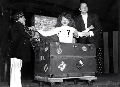 Orson Welles produces Rita Hayworth from a steamer trunk, 1943