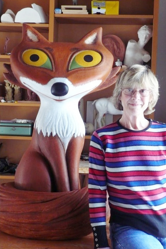 Here is a recent photo of Mimsy Farmer with one of her creations, a fox named Gilda, created for a commercial art campaign.