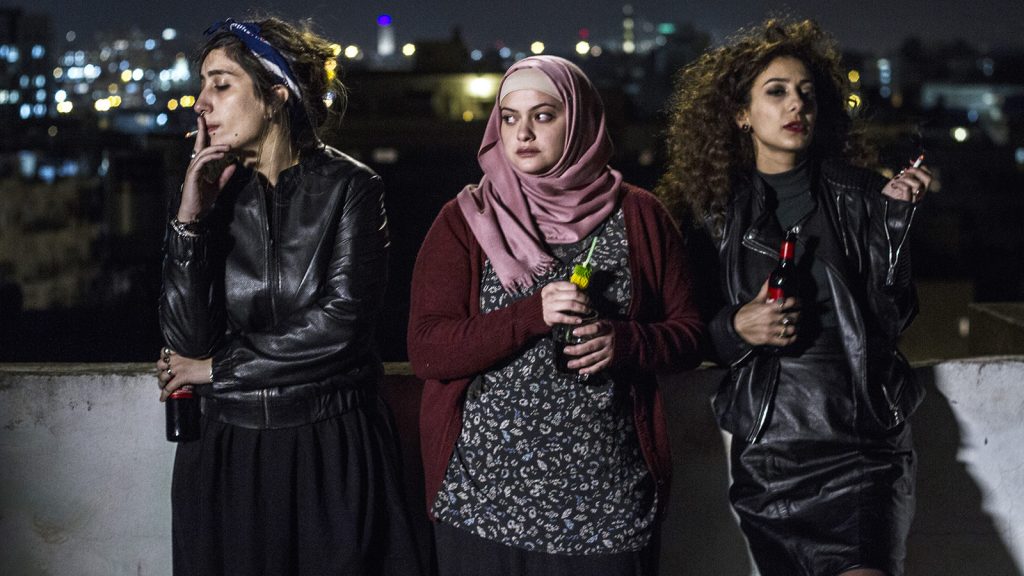 Laila (Mouna Hawa), who hails from Haifa, is a beautiful, unconventional, chain-smoking lawyer; she shares an apartment with Salma (Sana Jammelieh), a DJ who disdains her Christian parents’ constant attempts to marry her off. Their life of non-stop nightclubs and casual drug use is suddenly disrupted by the arrival of a third flatmate, Nur (Shaden Kanboura), an observant Muslim from Umm al-Fahm. Though Nur is initially put off by her new roommates’ unapologetically secular lifestyle – and they by her conservatism – all three gradually realize that their similarities are greater than their differences. The film highlights concrete signifiers of the women’s differences: it lingers on Laila’s crisp white button-down shirts as she dresses for work, on Selma’s defiantly shapeless dress as she prepares for yet another meeting with a potential suitor, on Nur’s careful wrapping of her headscarf. As soon as it acknowledges these differences, though, it works to expose them as superficial.